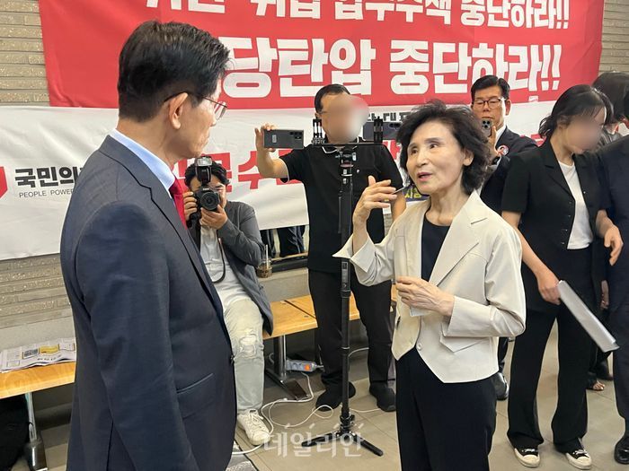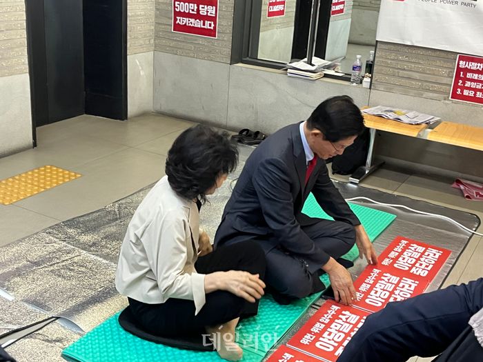 무거운 침묵이 감돌던 서울 여의도 국민의힘 중앙당사 1층. 김문수 후보는 8일째 농성을 이어가며 꼿꼿이 가부좌를 틀고 앉아 있었다. 하얀 자켓을 입은 여성이 등장하자 장내는 순식간에 웃음꽃이 피었다. 김문수 후보의 배우자, 설난영 여사였다.