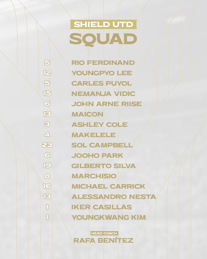 이로써 '2025 아이콘매치' 양팀 감독 및 선수 명단이 모두 확정됐다. 아르센 벵거가 ‘FC 스피어, 라파엘 베니테스가 ‘실드 유나이티드’의 사령탑을 맡고, 호나우지뉴·베일·루니·리베리·부폰(이상 ‘FC 스피어')과 카시야스·마켈렐레·마이콘·마르키시오·캐릭·네스타(이상 ‘실드 유나이티드’) 등이 새롭게 합류한다.