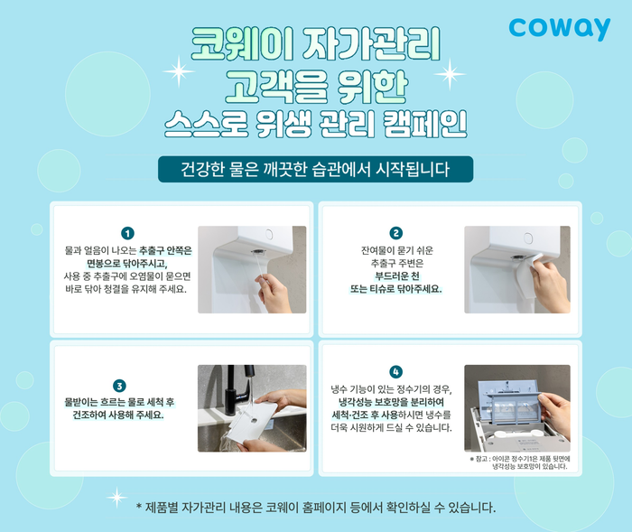 코웨이가 위생 관리가 중요한 여름철, 고객에게 생활 속 정수기 청결 관리법을 안내하는 ‘스스로 위생 관리 캠페인’을 전개한다고 26일 밝혔다.