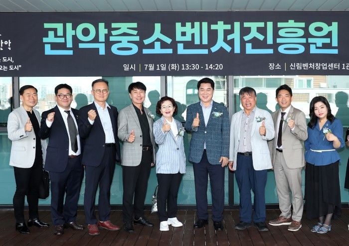 지난 7월 관악중소벤처진흥원 출범식에 참여한 박준희 관악구청장(오른쪽 네 번째)과 김준학 관악중소벤처진흥원장(오른쪽 세 번째)ⓒ