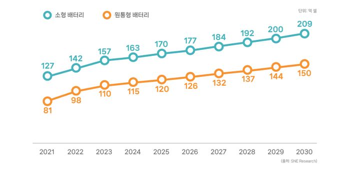 한편, 원통형 배터리 시장은 전기차 시장의 성장에 힘입어 폭발적인 성장세를 보이고 있다. 시장조사기관 SNE리서치에 따르면 2022년 98억개였던 원통형 배터리 판매량은 2030년 150억개를 넘어설 것으로 전망된다.
