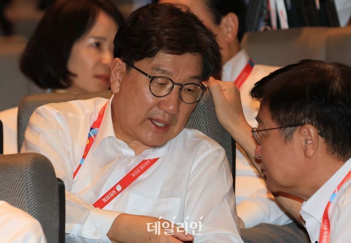 권성동 국민의힘 의원이 지난 28일 오후 인천 중구 인천국제공항공사 항공교육원에서 열린 2025 국민의힘 국회의원 연찬회에서 동료 의원과 대화를 하고 있다. 김건희 여사 의혹을 수사 중인 민중기 특별검사팀은 이날 연찬회 도중 권 의원에 대한 구속영장을 청구했다. ⓒ데일리안 홍금표 기자