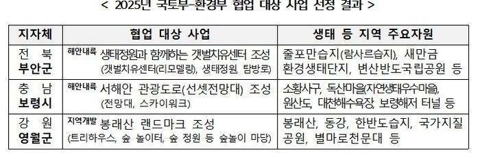 국토교통부와 환경부가 ‘지속가능한 지역균형개발 및 생태관광 활성화 연계’ 협업 사업 대상지로 전북 부안군(생태정원 및 갯벌치유센터), 충남 보령시(선셋전망대), 강원 영월군(봉래산 랜드마크) 등 3곳을 다음 달 1일자로 최종 확정한다고 31일 밝혔다.