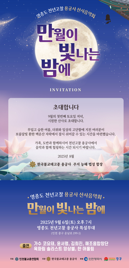 인천시는 다음 달 6일 영종도 千年고찰 용궁사에서 ‘만월이 빛나는 밤에’를 주제로 山寺 음악회를 개최한다고 31일 밝혔다.