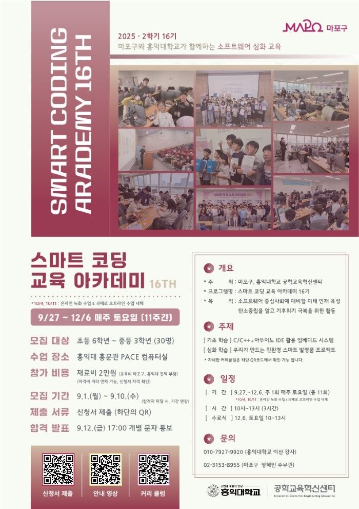 마포구와 홍익대학교가 공동으로 운영하는 '스마트 코딩 교육 아카데미'는 청소년들이소프트웨어 역량을 기르고 친환경 발명 프로젝트를 직접 체험할 수 있도록 마련된 프로그램이다.
