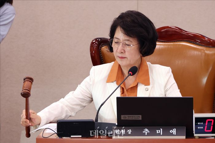 추미애 국회 법사위원장이 지난달 26일 오후 국회에서 열린 국회 법제사법위원회 전체회의에서 의사봉을 두드리고 있다. ⓒ데일리안 홍금표 기자