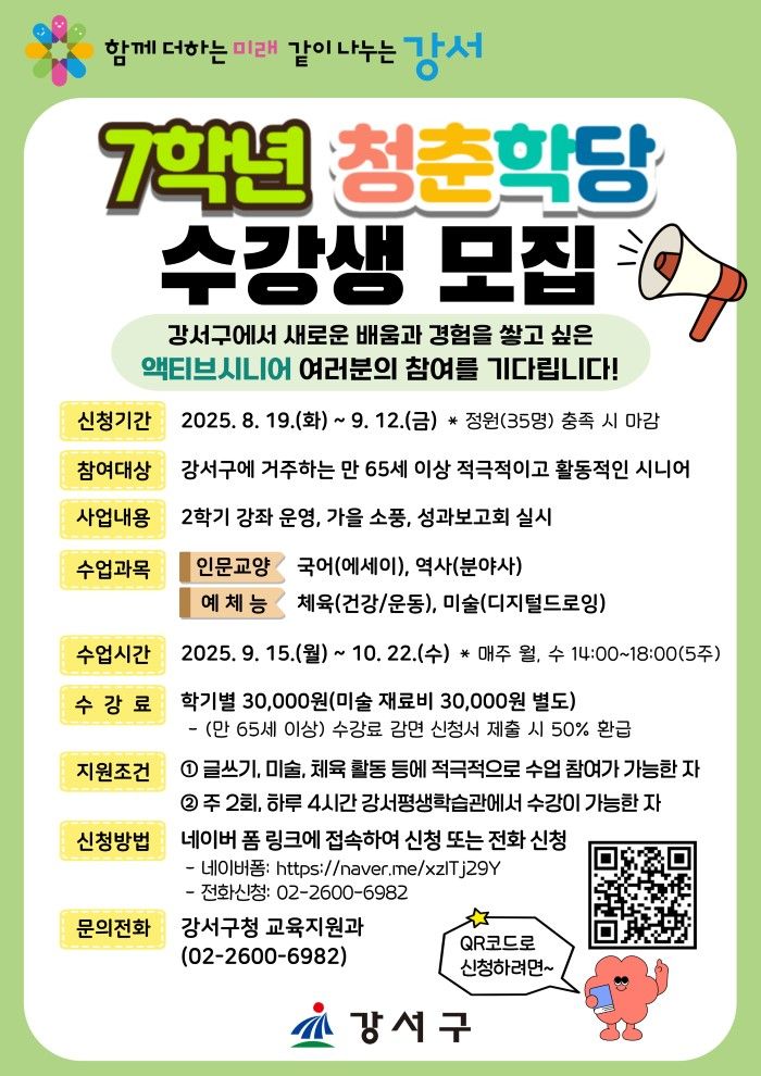 진교훈 강서구청장은 "초고령사회에 접어든 지금, 어르신들에게 배움은 활기찬 노후를 여는 중요한 열쇠"라며 "7학년 청춘학당에서 배우고 함께하는 즐거움으로 다시 한번 행복한 학창 시절을 맞이하길 바란다"고 말했다. 이어 “앞으로도 어르신들의 행복한 노년을 위한 다양한 평생학습 기회를 확대해 나가겠다”고 덧붙였다.