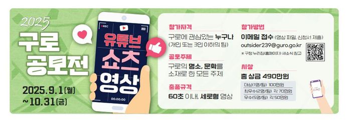 서울 구로구(구청장 장인홍)가 구민과 함께 구로의 매력을 담아낼 '2025 구로구 유튜브 쇼츠 영상 공모전'을 개최한다고 2일 밝혔다.
