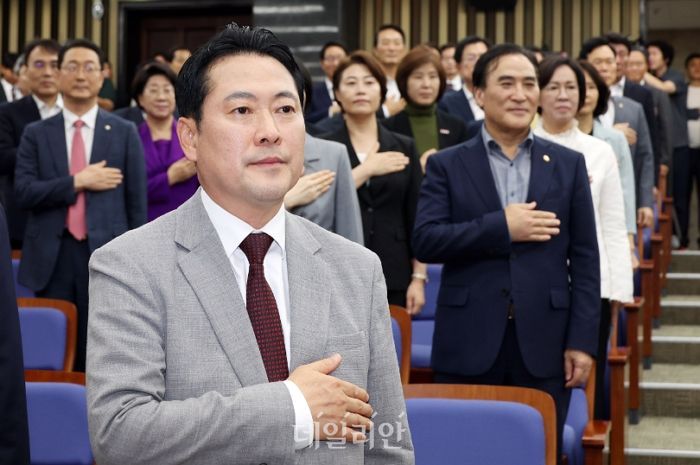 장동혁 국민의힘 대표가 8월27일 오후 서울 여의도 국회에서 열린 국민의힘 의원총회에서 국민의례를 하고 있다. ⓒ데일리안 홍금표 기자