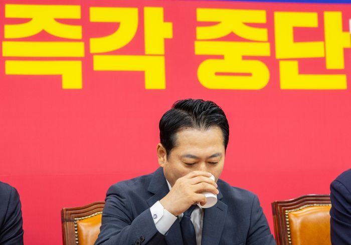 국민의힘 장동혁 대표가 3일 국회에서 열린 긴급 최고위원회 회의에서 발언을 마친 뒤 물을 마시고 있다.ⓒ연합뉴스