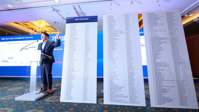 실제 대한상의와 김영주 부산대 교수 연구팀이 수행해 발표된 '차등규제 전수조사' 결과를 보면, 경제 관련 12개 법안에만 343개의 기업별 차등 규제가 있었다. 중소기업에서 중견기업이 되는 순간 94개의 규제가 갑자기 늘고, 대기업이 되면 329개까지 급증했다. 최 회장은 343건에 이르는 규제를 180㎝에 이르는 자신의 키 만한 대형 패널 3장을 준비해 참석자들에게 보여주기도 했다.