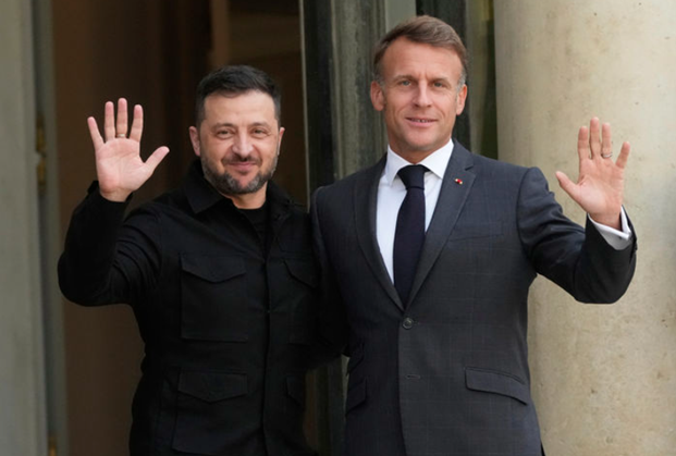 에마뉘 마크롱(오른쪽) 프랑스 대통령과 볼로디미르 젤렌스키 우크라이나 대통령이 3일 파리 엘리제궁에서 손을 흔들고 있다. ⓒAP/뉴시스