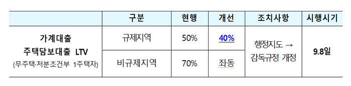 정부가 주택담보대출 담보인정비율(LTV) 상한을 규제지역 50%에서 40%로 낮추는 등 전방위적 가계부채 관리 강화책을 발표했다.