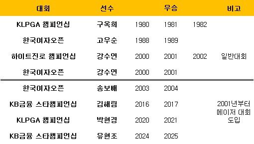 메이저 대회 도입 이전에는 구옥희가 1980년부터 1982년까지 KLPGA 챔피언십을 3연패했고, 1988년과 1989년 고우순이 한국여자오픈서 바통을 이어받았다. 강수연은 2000년부터 2002년까지 하이트진로 챔피언십을 3연패했으나 당시 이 대회는 일반 대회로 치러졌고, 대신 2000년과 2001년 한국여자오픈을 2연패에 전성기를 구가했다.
