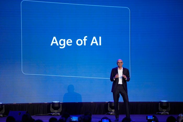 사티아 나델라 마이크로소프트 최고경영자(CEO)가 인공지능(AI) 관련 연설에 나선 모습(자료사진) ⓒAP/뉴시스