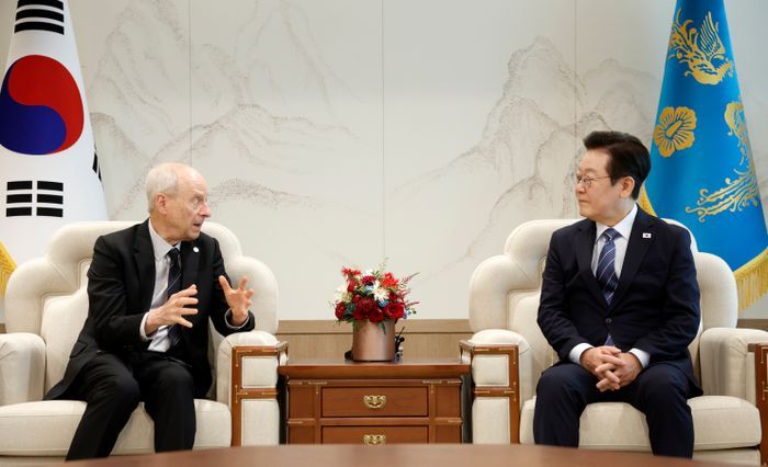 이 대통령은 "대한민국은 어려운 과정을 겪긴 했지만 빛의 혁명을 통해 정의로운 사회를 향한, 그야말로 민주적인 사회, 연대의 공동체 이런 것을 현실 사회에서 만들어나가는 모범이 돼가고 있지 않나. 그런 자부심도 있다"고도 강조했다.