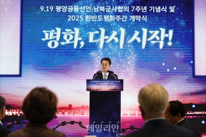 김동연 경기도지사가 19일 오후 경기 파주 캠프그리브스에서 열린 9·19 평양공동선언 7주년 기념식에서 환영사를 하고 있다.