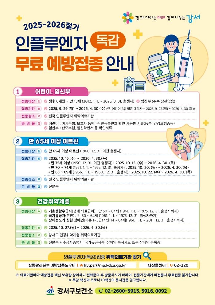 해당 접종은 강서구 건강취약계층 위탁의료기관에서 가능하며, 신분증 외에 장애복지카드, 수급자증명서, 국가유공자증 등 관련 서류를 지참해야 한다.