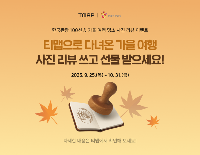 티맵모빌리티는 가을 여행의 즐거움을 함께 나누기 위해 ‘한국관광 100선 방문 인증 이벤트’와 ‘가을 여행 사진 리뷰 이벤트’를 진행한다고 26일 밝혔다.