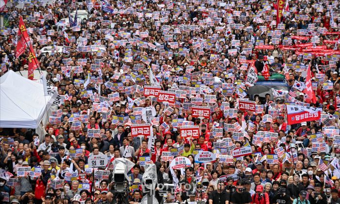 28일 오후 서울 중구 세종대로 일대에서 국민의힘 '사법파괴·입법독재 국민 규탄대회'가 열리고 있다.