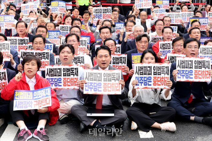 국민의힘 장동혁 대표, 송언석 원내대표 등 당 지도부가 28일 오후 서울 중구 세종대로 일대에서 열린 국민의힘 '사법파괴·입법독재 국민 규탄대회'에서 피켓을 들며 구호를 외치고 있다.