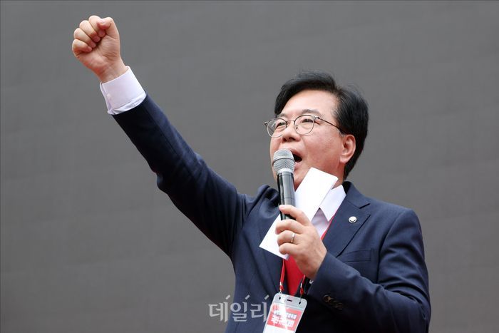 송언석 국민의힘 원내대표가 28일 오후 서울 중구 세종대로 일대에서 열린 국민의힘 '사법파괴·입법독재 국민 규탄대회'에서 규탄사를 하고 있다.