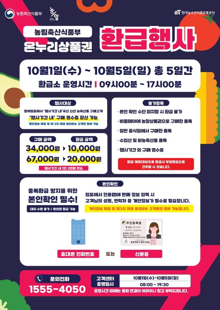 행사 기간 중 참여 점포에서 국산 신선 농축산물 또는 수산물을 구매한 소비자는 구매 금액의 최대 30%를 온누리상품권으로 환급받을 수 있다. 품목별(농축산물, 수산물)로 1인당 각각 2만원까지 환급이 가능해, 두 품목을 모두 이용하면 최대 4만원의 혜택을 받을 수 있다. 환급 금액은 ▲3만4000원 이상~6만7000원 미만 구매 시 1만원 ▲6만7000원 이상 구매 시 2만원이다.