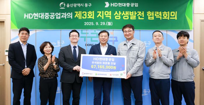 HD현대중공업은 29일 울산광역시 동구청에서 ‘추석 명절 위문품 전달식’을 갖고 울산 동구 지역 취약계층 1000세대에 온누리상품권 5000만원을 기탁했다.
