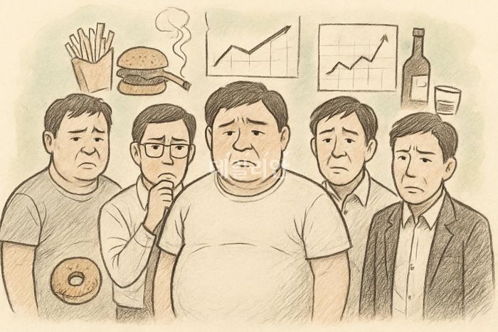 만성질환도 동반 상승했다. 고혈압 유병률은 남성 26.3%, 여성 17.7%로 각각 2.9%p, 1.2%p 올랐다. 당뇨병은 남성 13.3%, 여성 7.8%였고, 고콜레스테롤혈증은 남녀 모두 23.4%를 기록했다. 특히 40대 남성은 비만이 11.5%p나 늘었고, 주요 만성질환 유병률도 모두 증가해 고위험 집단으로 꼽혔다.