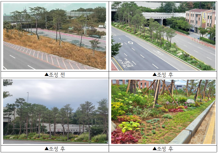 또한, 매력 정원의 녹지대 단차 해소를 위해 조경석을 쌓고 차량 운전자의 시야 높이를 고려하는 등 단순한 식재를 넘어 주변 경관과 조화를 이루는 정원형 가로녹지를 구현했다.