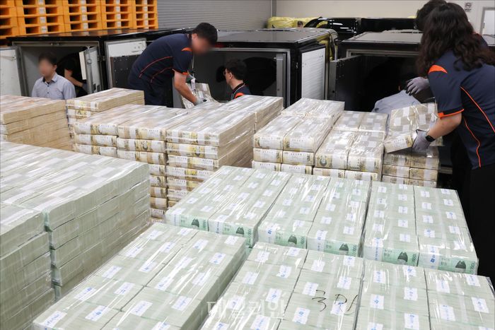 30일 서울 중구 한국은행 화폐수납장에서 관계자들이 추석 화폐 공급을 하고 있다.