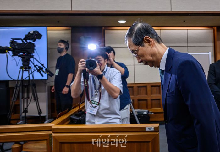 '내란 방조' 혐의로 특검에 기소된 한덕수 전 국무총리가 30일 오전 서울 서초구 서울중앙지방법원에서 열린 첫 공판에 출석하고 있다.