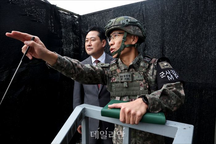 국민의힘 장동혁 대표가 30일 경기 포천시 육군 제6보병사단 2여단 GOP대대에서 김진성 사단장으로부터 지형 관련 설명을 듣고 있다.