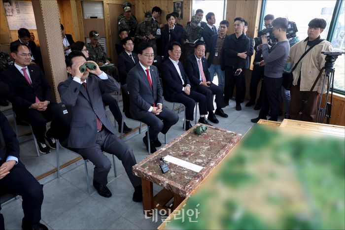 국민의힘 장동혁 대표와 송언석 원내대표, 국방위원회 소속 의원들이 30일 경기 포천시 육군 제6보병사단 2여단 GOP대대를 방문해 최전방 군사대비 태세 점검을 하고 있다.