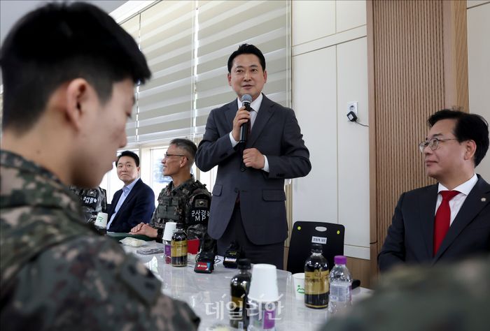 국민의힘 장동혁 대표가 30일 경기 포천시 육군 제6보병사단 2여단 GOP대대에서 장병들과 간담회 중 발언하고 있다.
