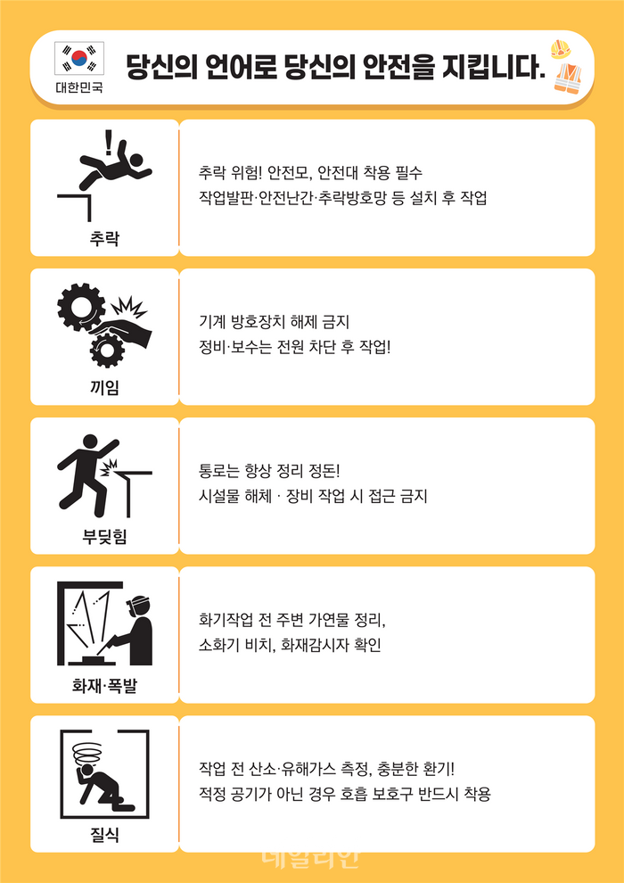 다국어 안전표지는 ‘당신의 언어로 당신의 안전을 지킵니다’라는 슬로건아래, 외국인노동자가 자신의 모국어로 핵심 안전수칙을 쉽게 이해할 수 있도록 제작됐다.