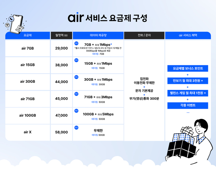 에어의 요금제는 고객 선호가 가장 높은 5G 핵심 데이터 구간 6개로 간결하게 구성된다. 필수적인 데이터와 음성 통화, 문자 서비스를 제공하고 부가 혜택을 없애 월정액 요금을 낮췄다. 2만9000원(7GB)부터 최대 5만8000원(무제한)으로 구성되며 적립한 포인트를 사용해 더 낮출 수 있다.