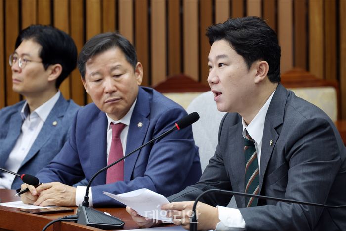진종오 국민의힘 의원이 1일 오전 서울 여의도 국회에서 열린 국민의힘 상임위원장 및 간사단 회의에서 더불어민주당의 종교단체 신도 동원 의혹과 관련해 발언을 하고 있다.