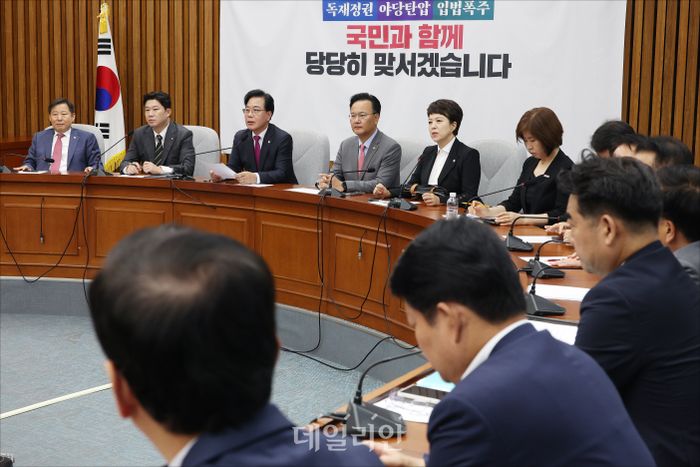 송언석 국민의힘 원내대표가 1일 오전 서울 여의도 국회에서 열린 국민의힘 상임위원장 및 간사단 회의에서 발언을 하고 있다.