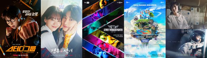 이번 시상식에 ▲ 티빙 오리지널 '스터디그룹'은 스트리밍 서비스 오리지널 최우수 작품상과 촬영 기술상 ▲ 드라마 '견우와 선녀'는 최우수 코미디 프로그램상 ▲ 예능'월드 오브 스트릿 우먼 파이터'는 최우수 음악·댄스 프로그램상 ▲ 시상식 '2024 MAMA AWARDS'는 최우수 예능 프로그램상 ▲ 드라마 '별들에게 물어봐'는 TV·영화 최우수 시각효과상에 각각 후보에 올랐다.