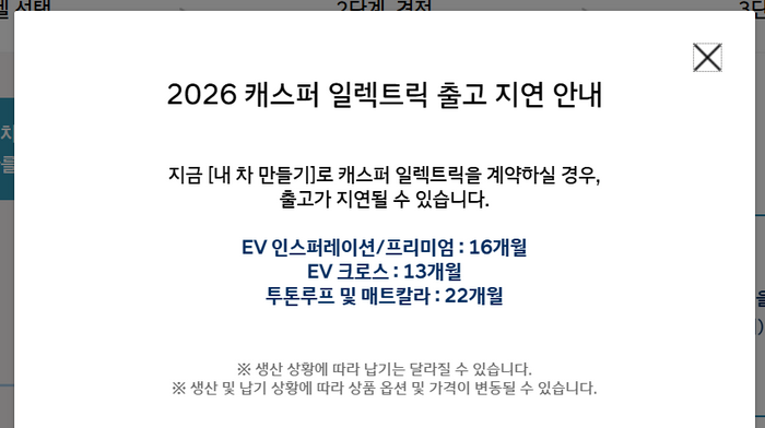 5일 현대자동차 캐스퍼 온라인 주문 홈페이지에는 캐스퍼일렉트릭의 신차 출고 기간이 최소 13개월에서 최대 22개월까지 지연될 수 있다고 안내되고 있다.