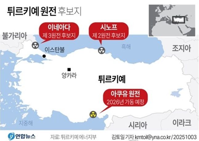 튀르키예는 러시아 국영 원전기업 로사톰과 함께 남부 메르신 지역에 아쿠유 원전을 건설중이다. 2번째 원전 후보지로 북부 시노프 지역을 정하고 중국, 캐나다, 한국 등을 협상 대상국으로 꼽아왔다. 내년 가동을 목표로 하고 있다.