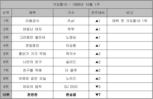 ◆‘가요톱10’ 1995년 10월 1주 : 편승엽 ‘찬찬찬’