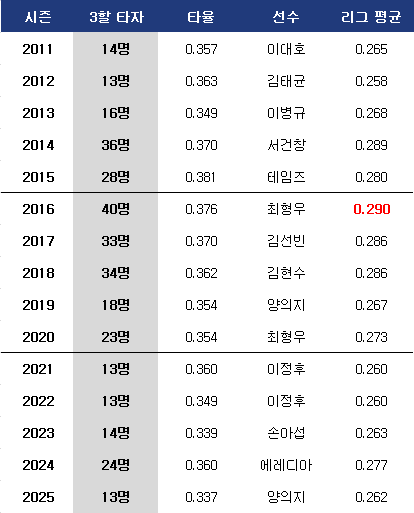 KBO리그는 144경기 체제로 확대된 뒤 매년 10~15명의 3할 타자가 나오고 있다. 이후 타고투저 현상이 뚜렷해진 2014년에는 무려 36명이 나왔고 2015년 28명, 그리고 2016년에는 역대 가장 많은 40명이 3할 타율을 기록한 바 있다. 특히 2016년은 리그 평균 타율이 0.290(역대 1위)에 이른 시기다.