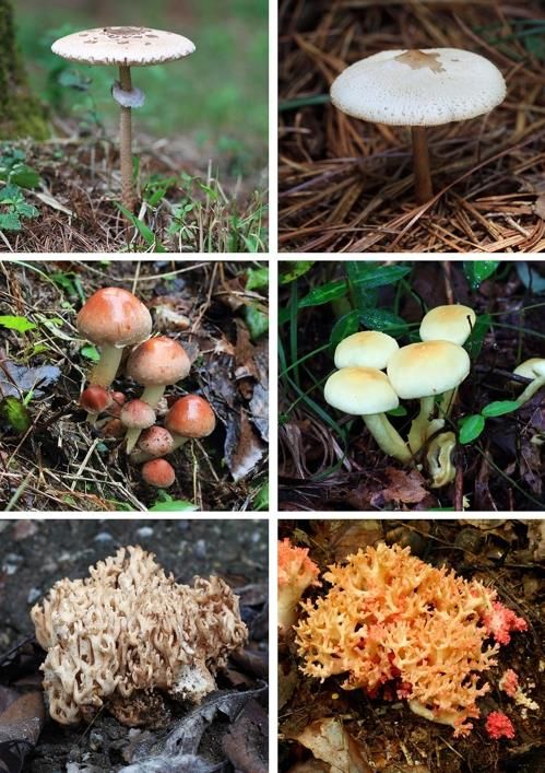사진 왼쪽은 식용, 오른쪽은 독버섯. 맨 위 큰갓버섯·독흰갈대버섯, 가운데 개암버섯·노란개암버섯, 아래 싸리버섯·붉은싸리버섯ⓒ국립수목원