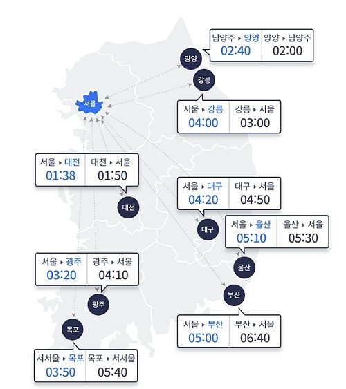 서울에서 부산까지는 5시간, 서울에서 울산은 5시간10분, 서울에서 대구는 4시간20분, 서서울에서 목포 3시간50분, 서울에서 광주 3시간20분, 서울에서 대전 1시간38분, 서울에서 강릉은 4시간, 남양주에서 양양은 2시간40분 걸릴 것으로 보인다.