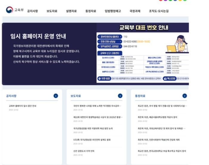 교육부는 공식 홈페이지 중단 이후 블로그 및 사회관계망서비스(SNS)를 통해 대표 전화번호와 보도·설명자료 등을 실시간으로 게시하고, 주요 공지사항을 수시로 안내하는 등 국민들의 불편을 최소화하기 위해 적극 대응하고 있다.
