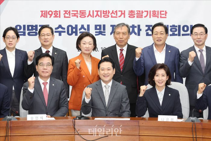 국민의힘 장동혁 대표, 송언석 원내대표, 나경원 제9회 전국동시지방선거 총괄기획단 위원장 등이 10일 오전 서울 여의도 국회에서 열린 국민의힘 제9회 전국동시지방선거 총괄기획단 임명장 수여식 및 제1차 전체회의에서 기념촬영을 하고 있다.