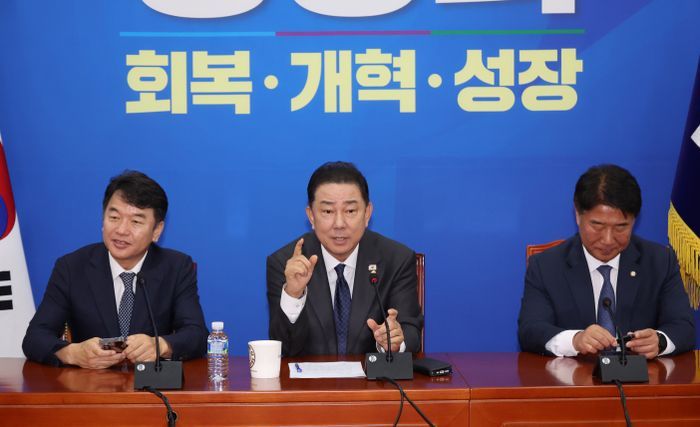민주당 김병기 원내대표·문진석 원내수석부대표는 10일 국회에서 브리핑을 열어 △재계 증인 최소화 △국회 상임위원회 중복 출석 지양 △집중 질의 등 '국감 증인·참고인 3대 원칙'을 발표했다.