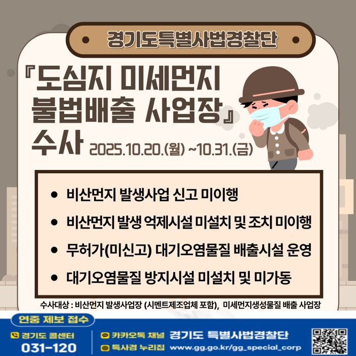 기이도 경기도 특별사법경찰단장은 “도심지 내 미세먼지 불법배출은 도민의 건강과 삶을 위협하는 중대하고 심각한 범죄행위”라며 “이번 수사를 통해 불법행위를 강력히 단속하고 도민이 안심하고 숨쉴 수 있는 안전한 생활환경 조성에 최선을 다하겠다”고 말했다.